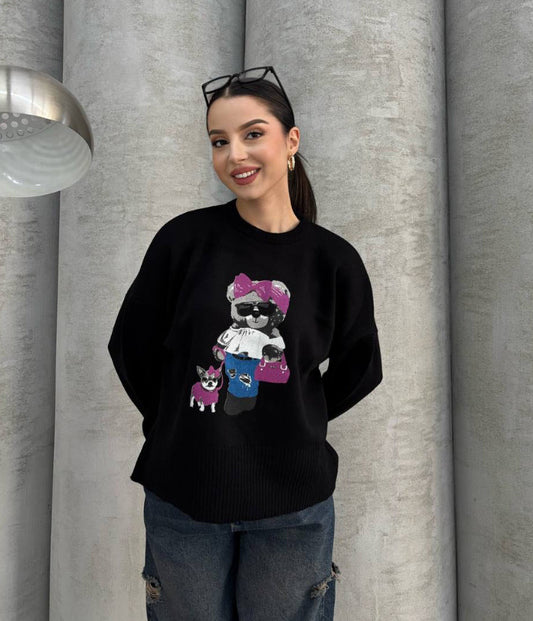white sweater with teddy bear