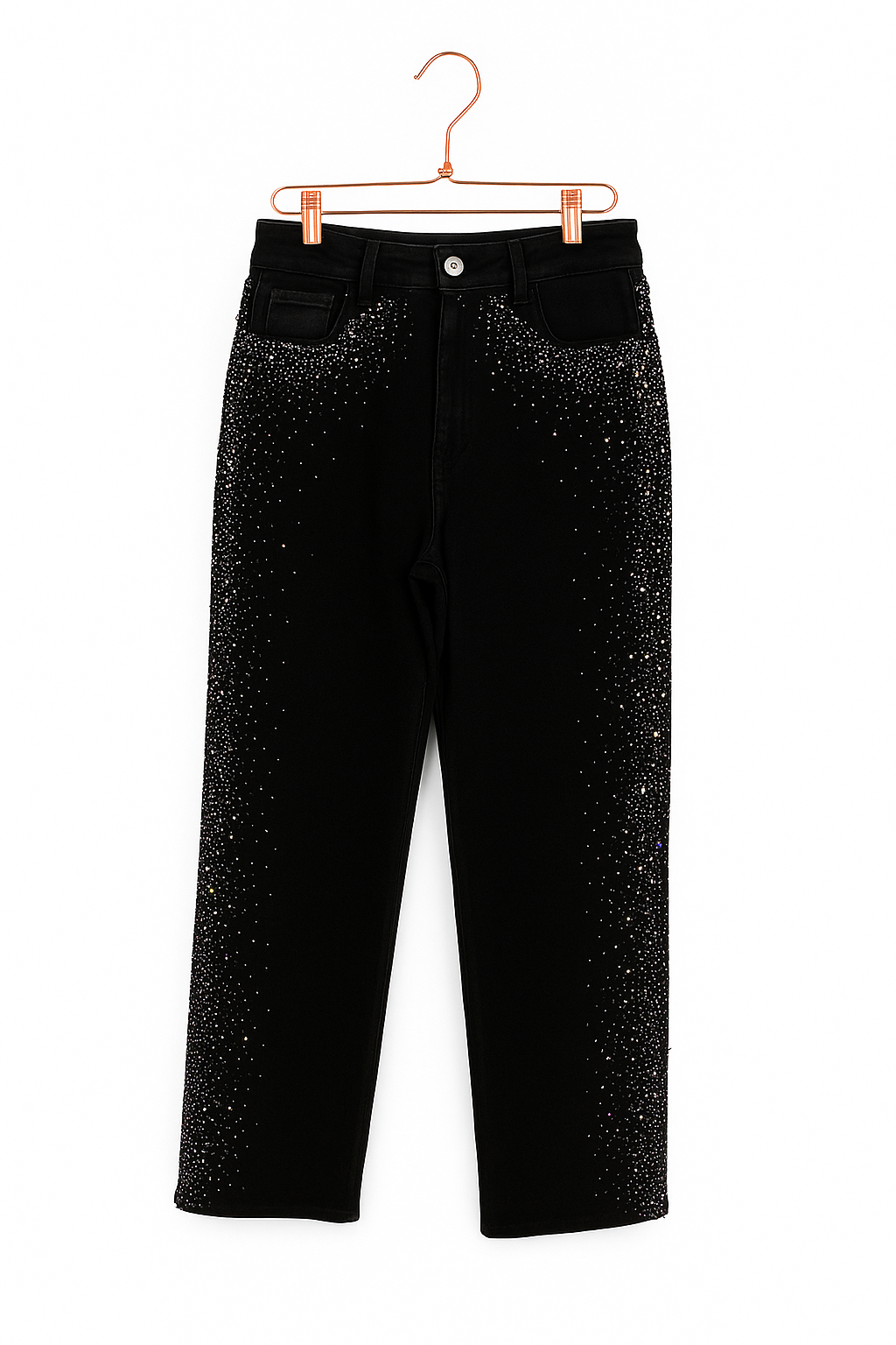 Jeans de mezclilla azul y negro con aplicación de brillos en los costados, perfectos para un look casual con un toque glam. Su diseño de tiro alto y corte recto realza la figura, aportando comodidad y estilo en cada paso. Ideales para combinar con tops o chaquetas y destacar con un brillo sutil y elegante.