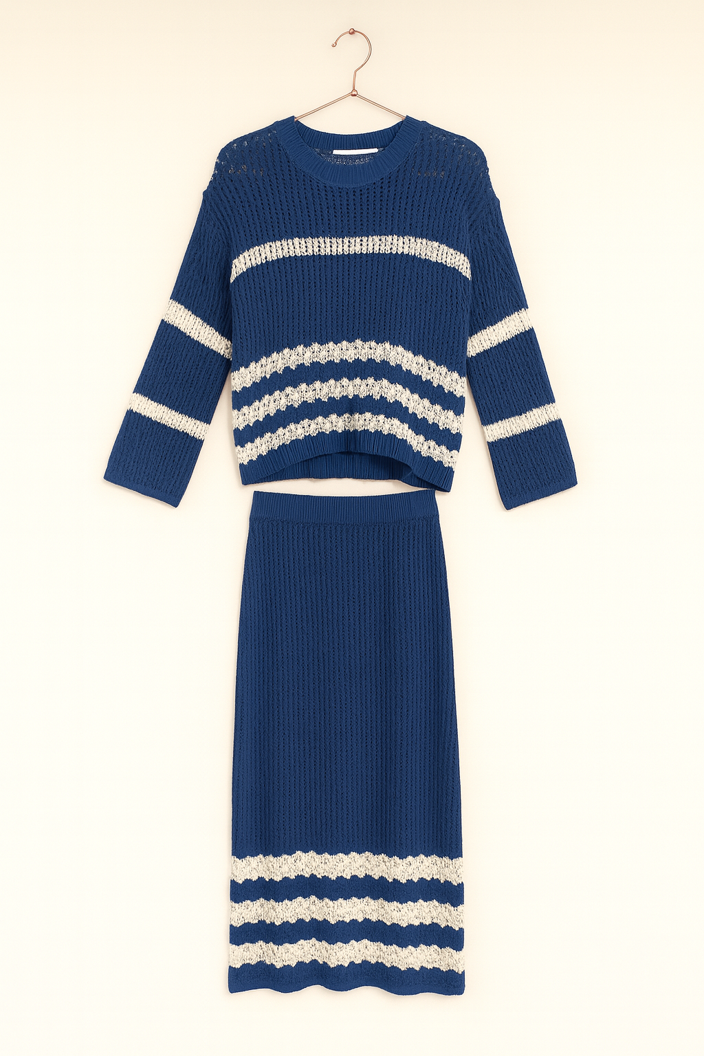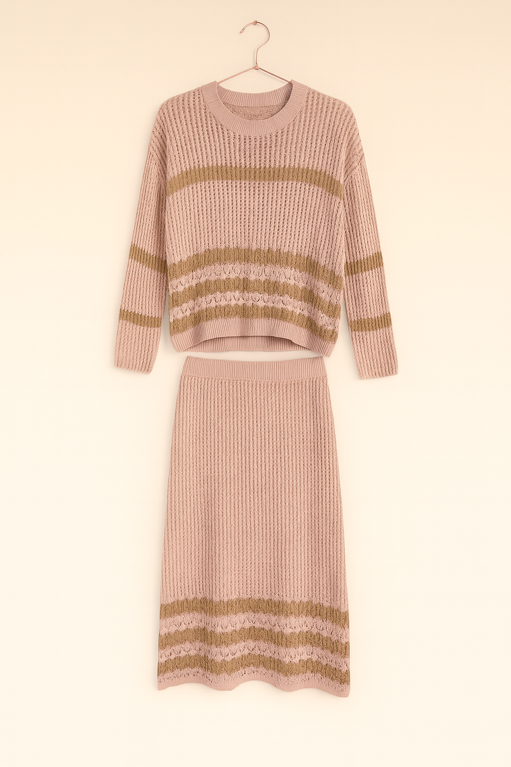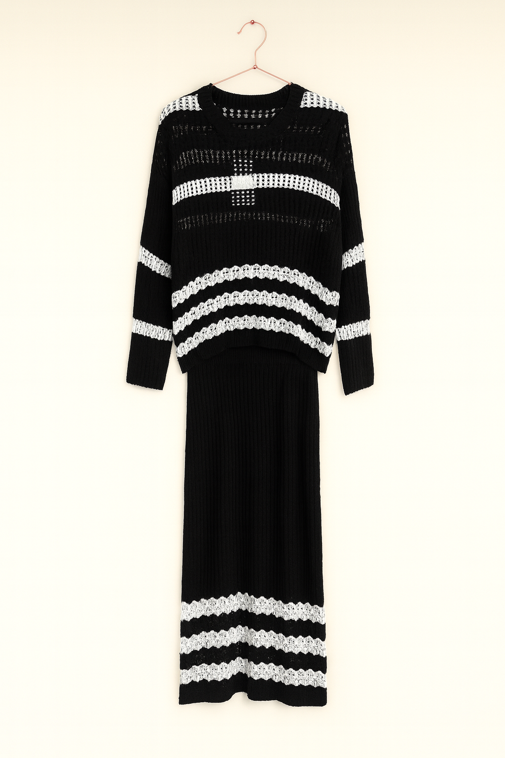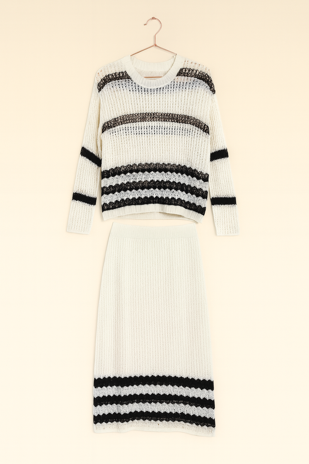 Conjunto tejido en con detalles en franjas que aportan contraste y sofisticación. Incluye suéter ligero de manga larga y falda midi, perfecto para un look casual chic o una salida elegante con el máximo confort.