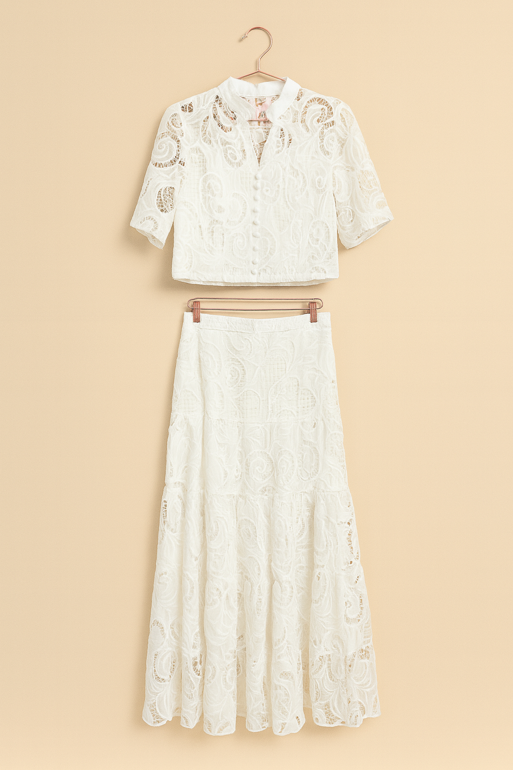 Conjunto blanco de blonda compuesto por blusa de botones y falda larga en capas. Un diseño elegante y fresco que combina transparencia sutil con delicados bordados, ideal para ocasiones especiales, eventos al aire libre o un look veraniego sofisticado.