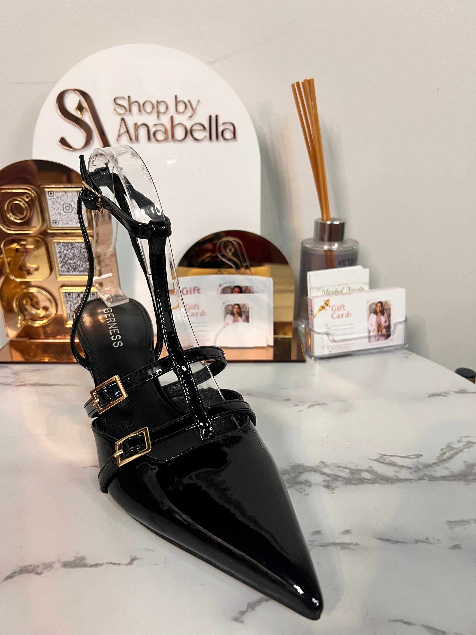 Patent leather pointed shoe with a medium-low thin heel and double strap