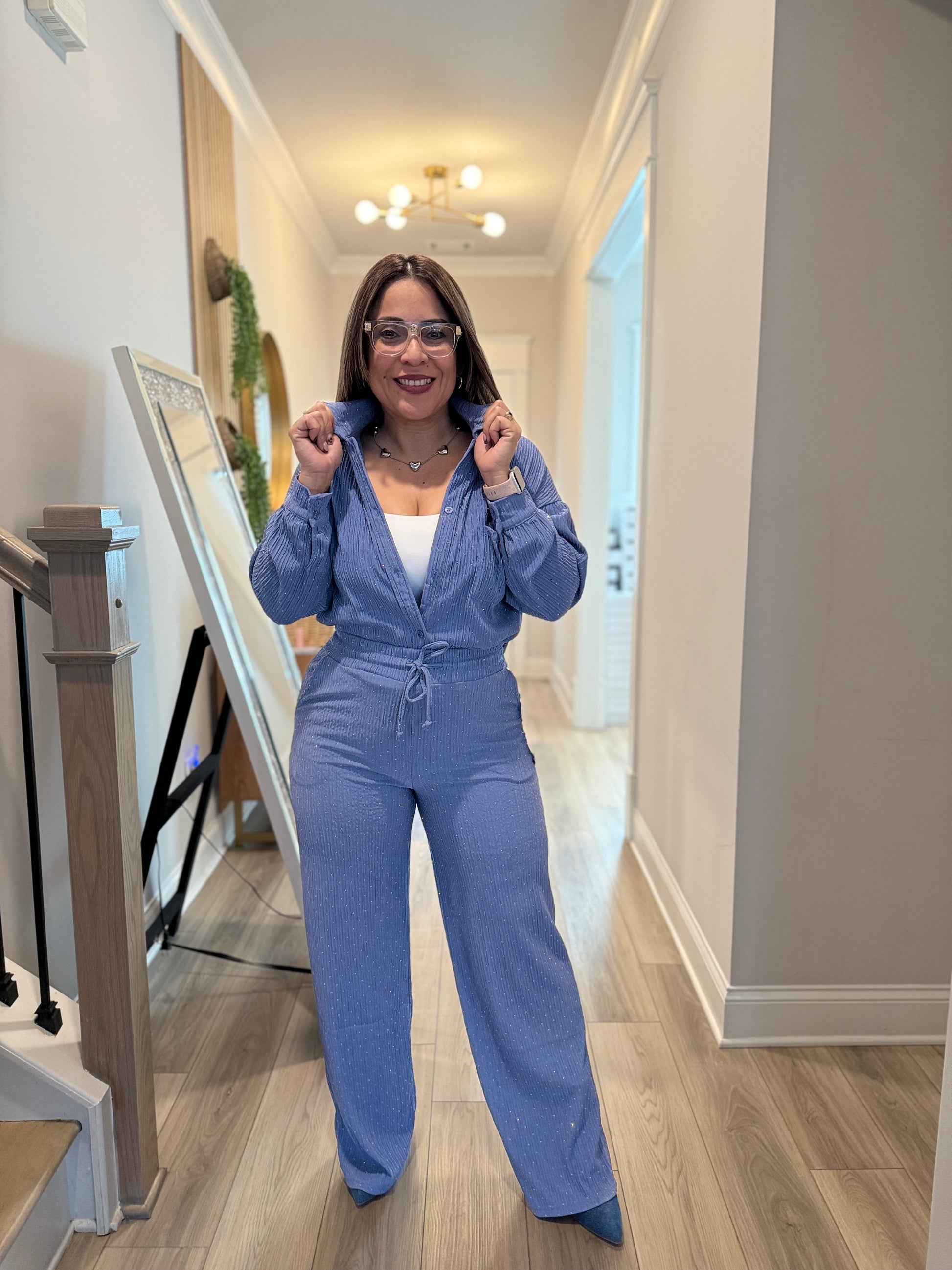 Set pantalón y blusa en botones con pequeños destellos plateados