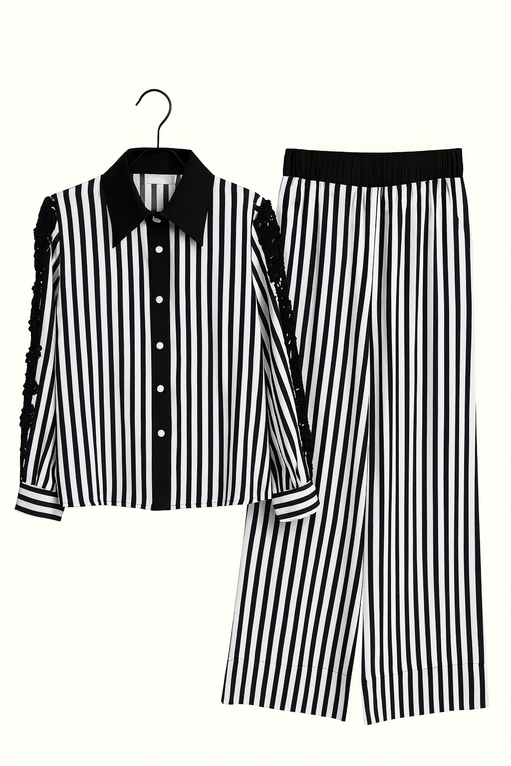 Set seda blanco con rayas negras y encaje negro en blusa y pantalón