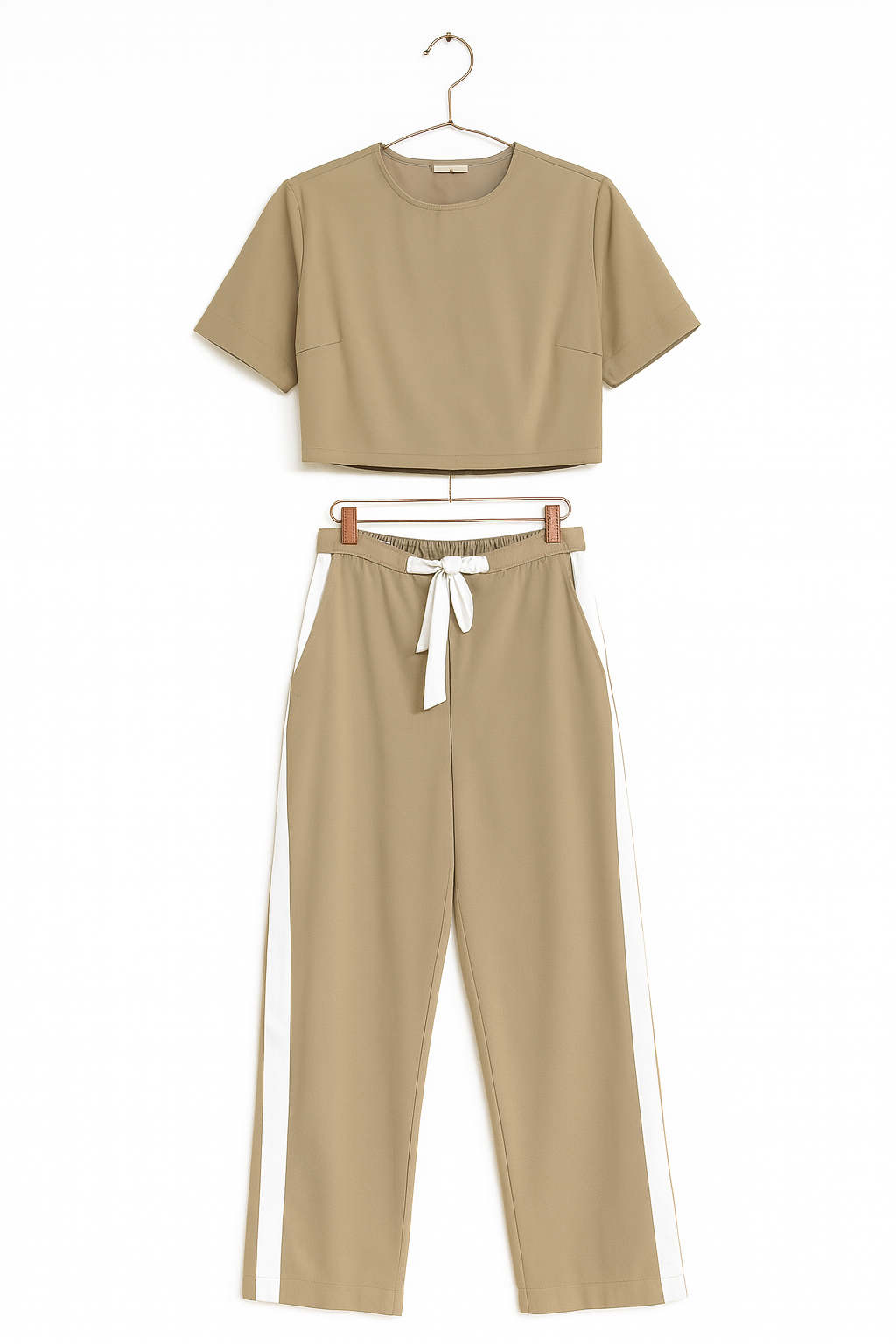 Set deportivo-chic en tono beige con franjas blancas laterales, compuesto por blusa básica y pantalón recto con lazo en la cintura. Ideal para un look cómodo y moderno que combina estilo y versatilidad.