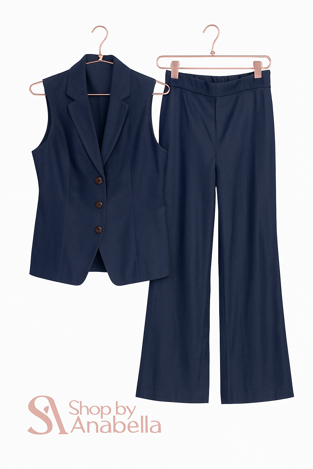 Conquer your day with this elegant navy set, featuring a structured sleeveless vest and flowing palazzo pants. A versatile and modern combination for women who want to look professional, comfortable, and stylish.